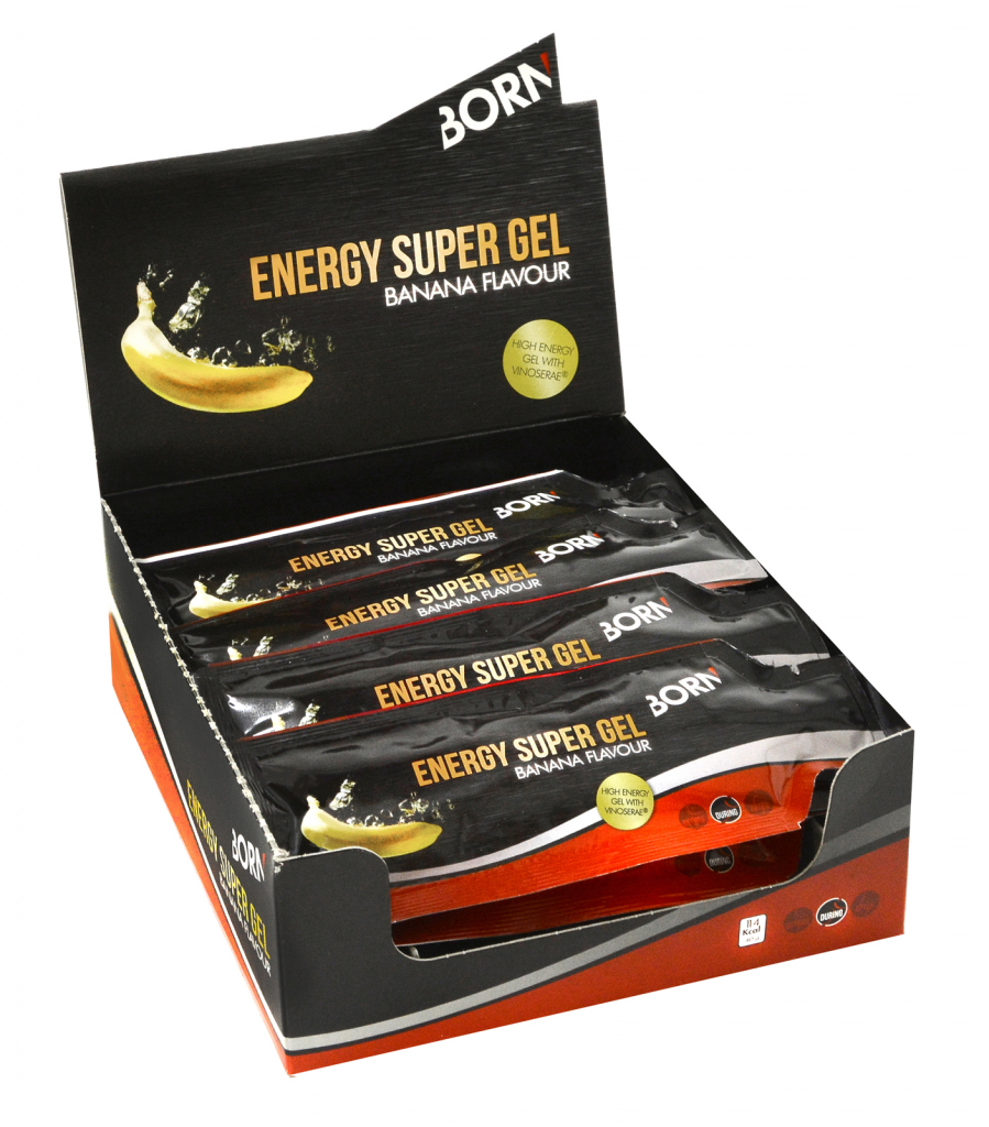 BORN ENERGY SUPER GEL is een geconcentreerde bron van snelle koolhydraten en zorgt voor extra energie. Soms is namelijk de inname van isotone drank niet voldoende. De ENERGY SUPER GEL is de ultieme bron van geconcentreerde koolhydraten die zorgen voor een snelle en langdurige energievoorziening en stevige trek helpt uit te stellen. Het toegevoegde, unieke extract uit rode wijn polyfenolen bevat veel antioxidanten. Gemaakt met echte bananenpuree! BORN ENERGY SUPER GEL wordt geleverd per gel van 40 gram.