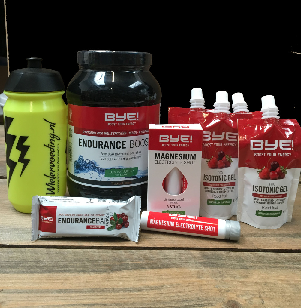 - bij de start zorg je er voor dat je 2 volle bidonnen met Bye Endurance booster op je fiets hebt en neem je 2 BYE Energy Gels en 1 BYE Endurance Bar mee in je zakken. Drink iedere 30 minuten 1 bidon BYE Endurance Booster en neem iedere 60 minuten een BYE Energy Gel Of BYE Endurance Bar om een hongerklop te voorkomen. Gebruik altijd je Endurance Booster na je gel of bar om het sneller te laten opnemen in het bloed.