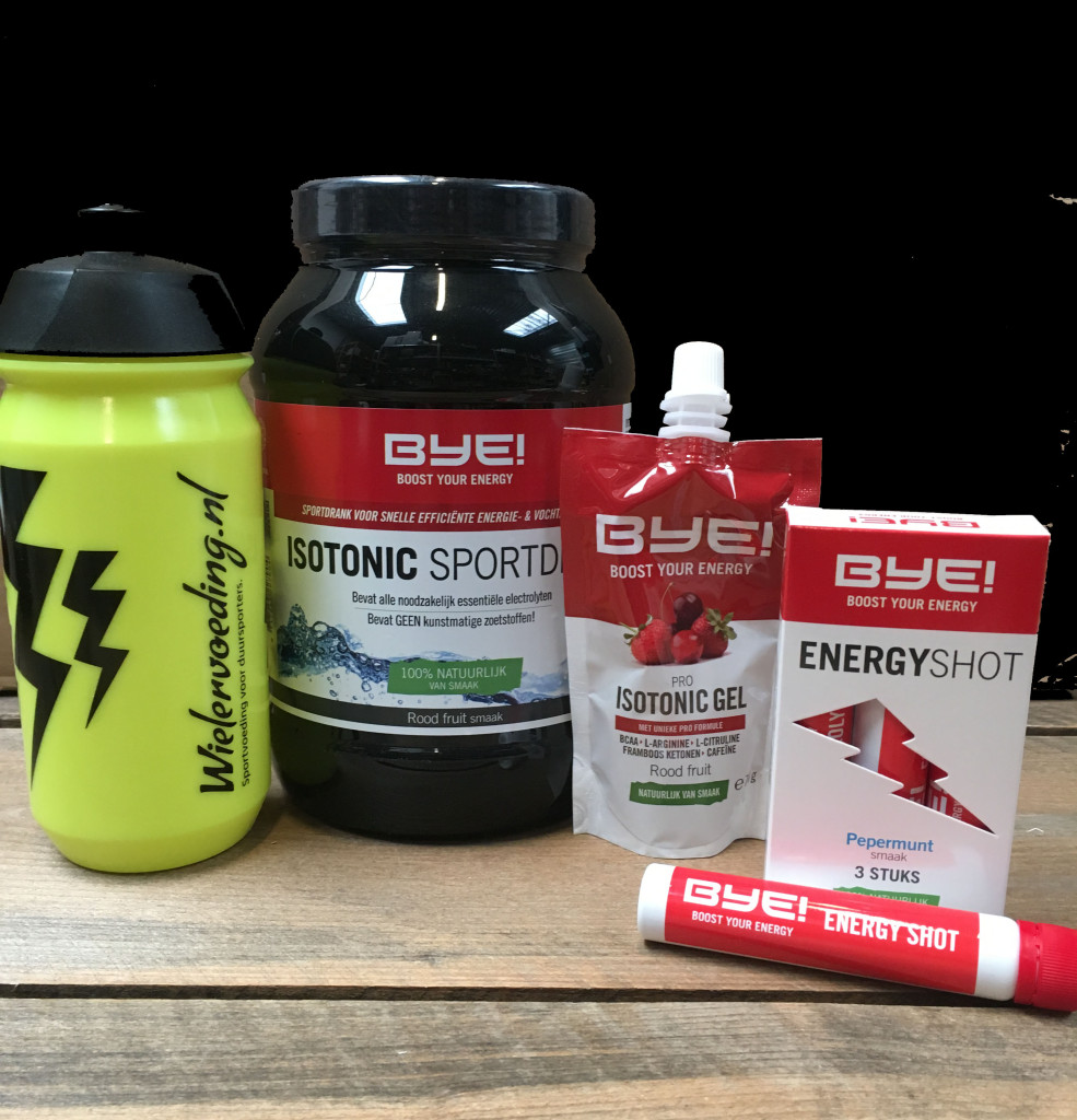 - bij de start zorg je er voor dat je 1 volle bidon op je fiets hebt met BYE Isotonic Sportdrink en neem 1 BYE! Energy Shot om je oppepper te geven.