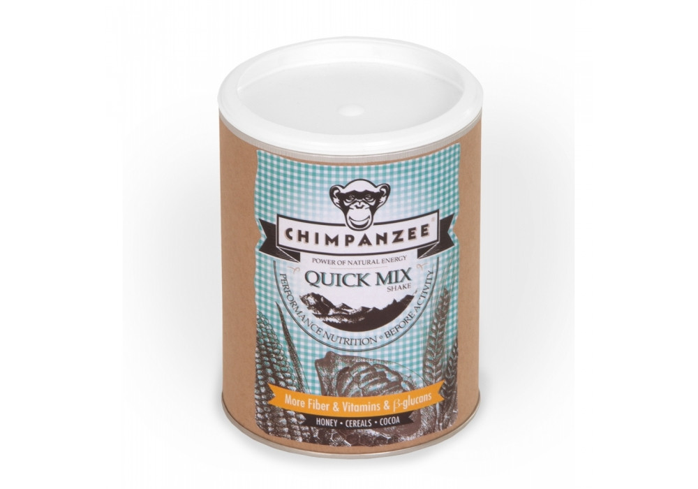 De QuickMIX shake bevat een mix aan granen (mais, gerst en haver), cacao, honing en soja lethicine voor een evenwichtige smaak. Ze is verrijkt met een brede waaier aan vitamines en haver B-glucanen, die helpen om het cholesterolpeil laag te houden. De Chimpanzee QuickMIX met zijn hoog gehalte aan oplosbare en niet-oplosbare vezels, bevat enkel plantaardige bestanddelen, waardoor de mix ook geschikt is voor vegetariërs en veganisten.