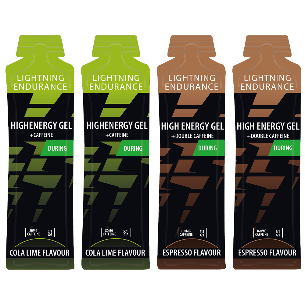 De Lightning Endurance High Energy Gel + Caffeine Mixed is een voordeelpakket met verschillende cafeïne gels, speciaal voor sporters die tijdens inspanning extra energie en focus willen.