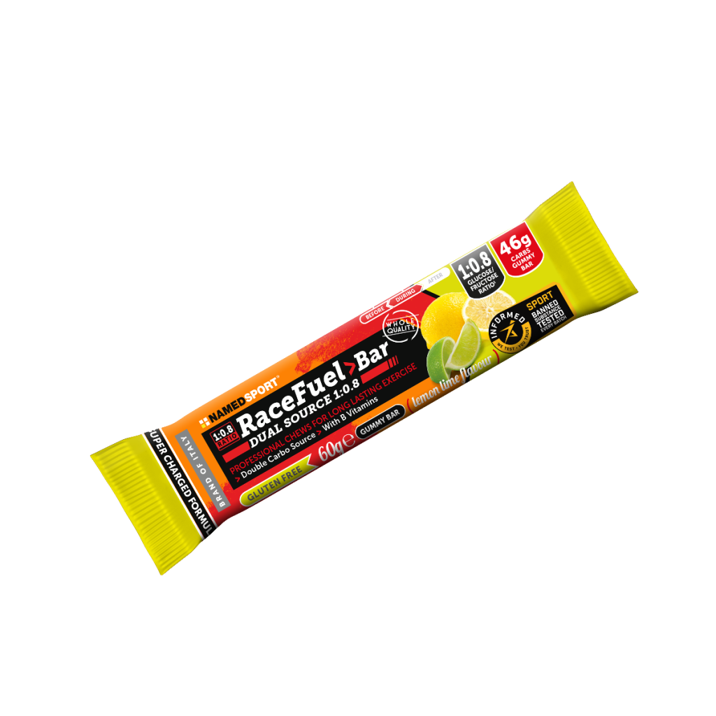 De Namedsport Race Fuel Bar is een compacte en makkelijk kauwbare energiereep, ontworpen voor intensieve sportmomenten en duurinspanningen. De reep bestaat uit twee zachte blokken van elk 30 gram, op basis van snel opneembare koolhydraten met een optimaal glucose:fructose-verhouding van 1:0,8 voor maximale opname. Verkrijgbaar in drie smaken: Framboos, Lemon-Lime en Cola-Lime. De Cola-Lime variant bevat bovendien 80 mg cafeïne per reep.