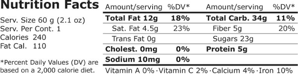 Ingrediënten: Dates*, Cashews*, Almonds*, Goji Berries*, Coconut*, Coconut Oil*, Cacao*, Water, Vanilla Bean*.