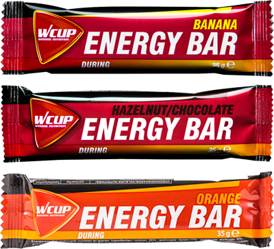 Ingrediënten van de Wcup Energy Bar (Orange): Rozijnen 35%, gedroogde dadels 17%, gedroogde abrikozen 9%, gedroogde vijgen 9%, gedroogde pruimen 8%, sinaasappelbestanddelen 5% (suiker, sinaasappelsap 1%, glucosesiroop, appelbestanddelen 1%, tarwekiemen, sinaasappelconcentraat 0,2%, cacaoboter, geleermiddel: pectine, voedingszuur: citroenzuur, sinaasappel olie), tarwemeel, wafers (tarwemeel, aardappelzetmeel), rijstmeel, tarwekiemen, gedroogde appels 2%, zonnebloemolie, voedingszuur: citroenzuur